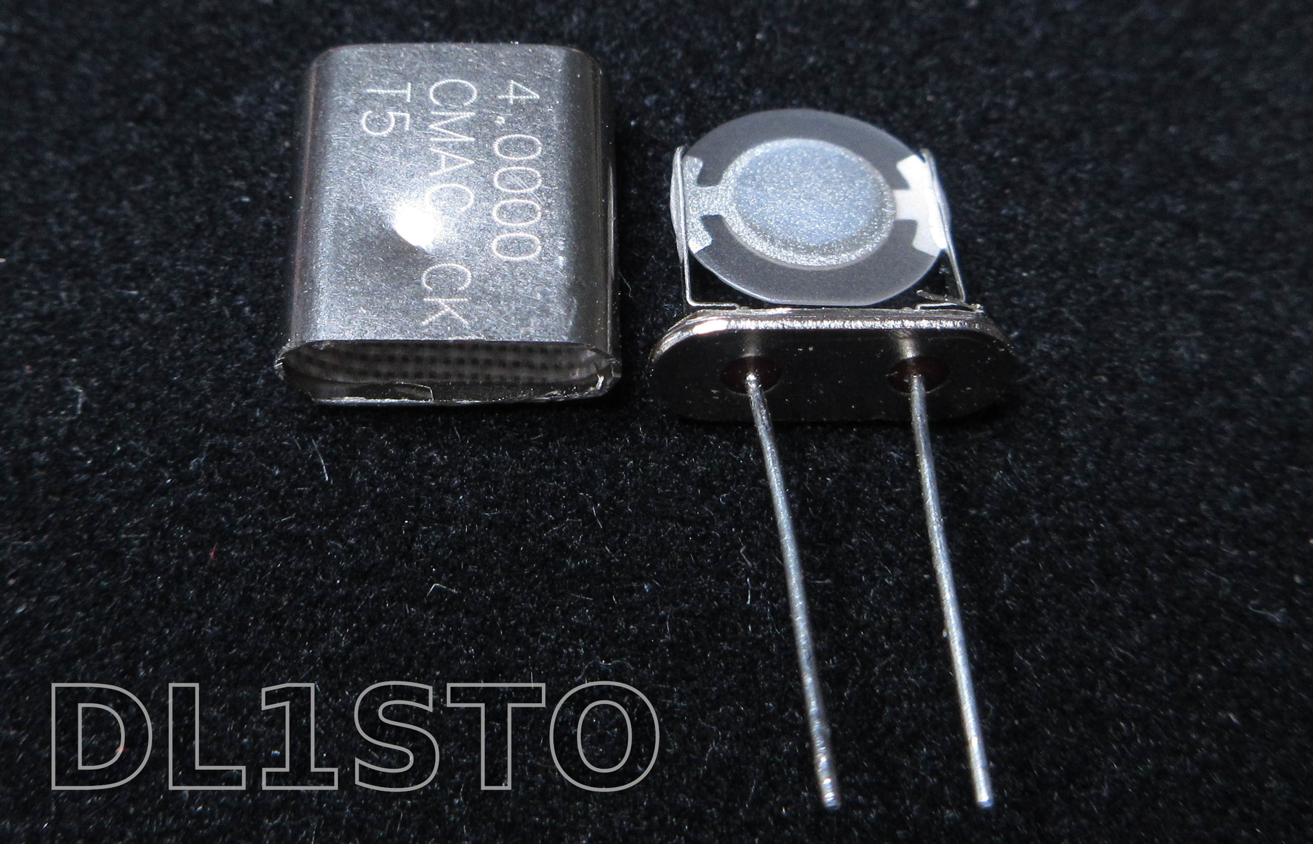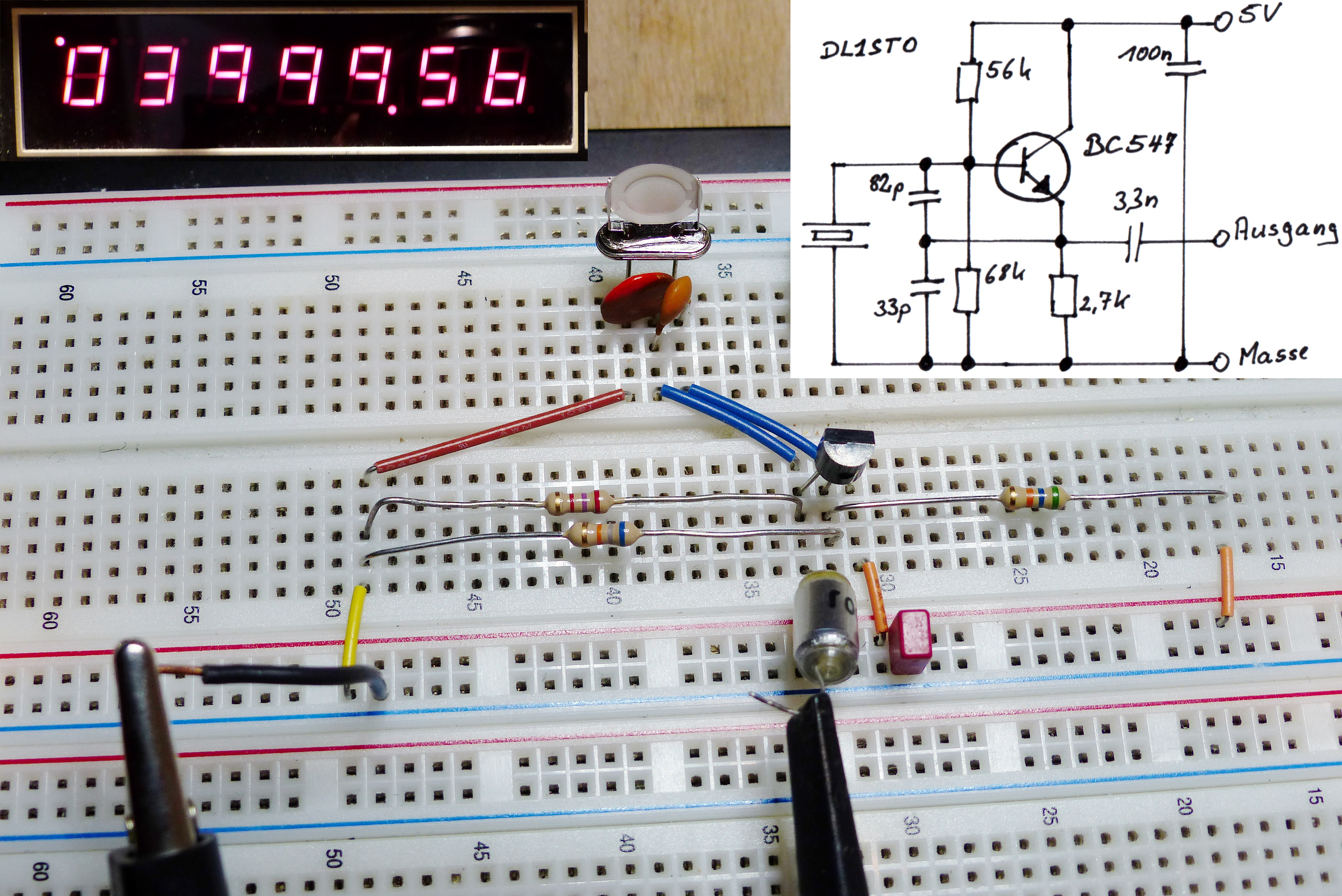 Bleibt nur noch zu prüfen, ob der Quarz nach dem Öffnen auch noch funktioniert. Eine schnell aufgebaute Testschaltung zeigt: ja, er funktioniert. Auch die Frequenz stimmt.