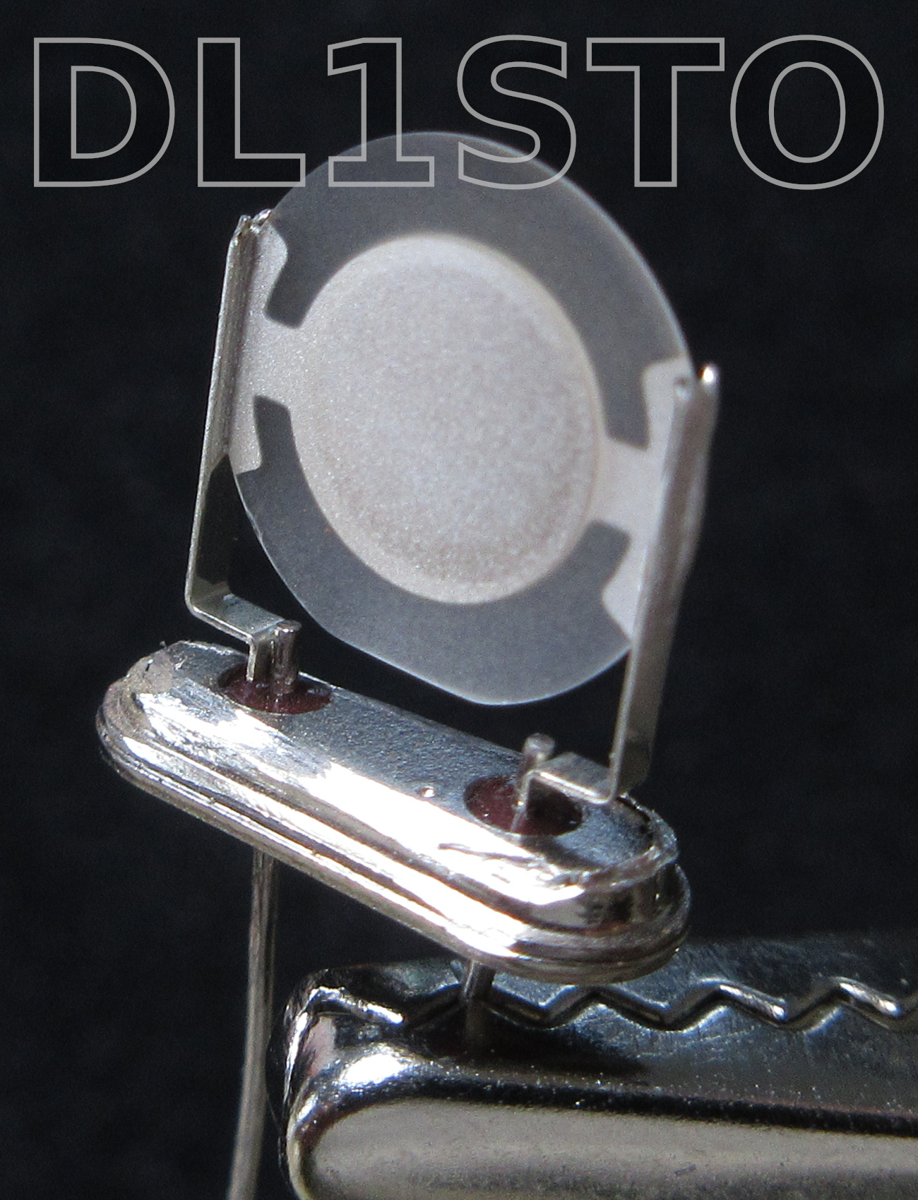 Nach dem Öffnen erkennt man eine Quarzscheibe, die auf beiden Seiten metallisch kontaktiert ist. Auf der Vorderseite ist der Metallkontakt nach links bis zum Rand geführt, auf der Rücksteit nach rechts. Dort, wo die Kontaktfläche an den Rand stößt, ist der Quarz an metallernen Halte- und Kontaktstiften befestigt, die auf die beiden Anschlußbeinchen führen. Die beiden folgenden Bilder zeigen den Quarz aus verschiedenen Perspektiven.